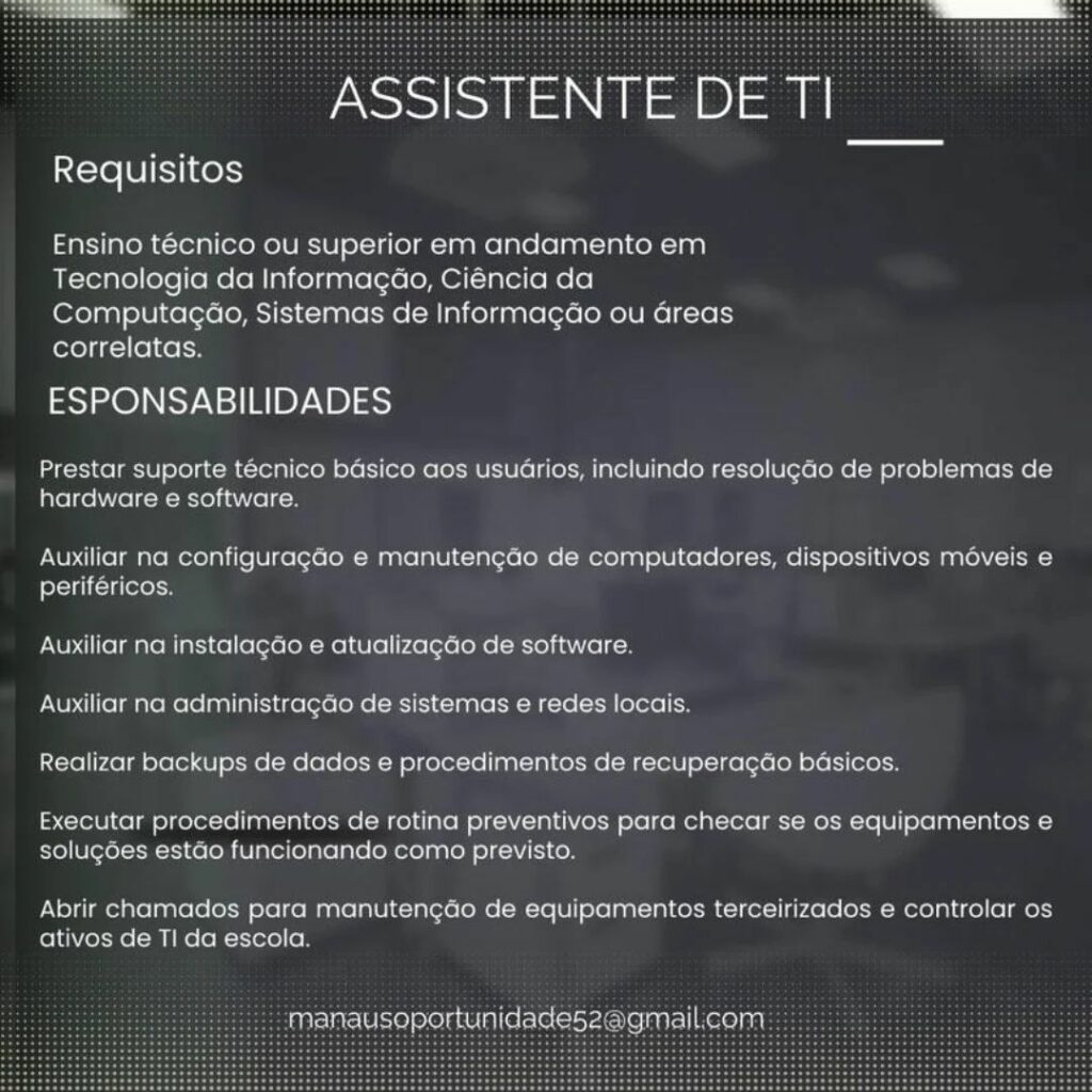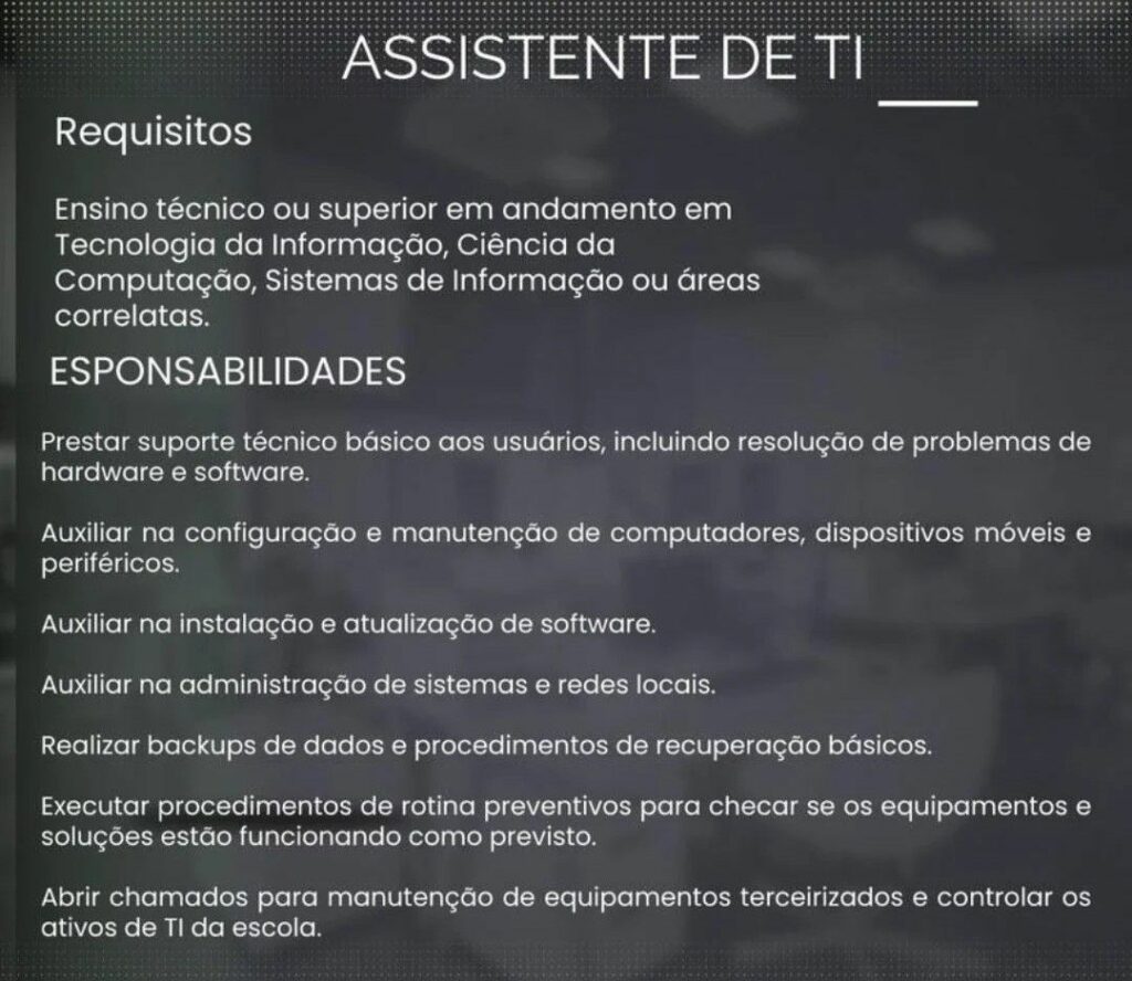 Empresa está selecionando Assistente de TI; Envie seu currículo!