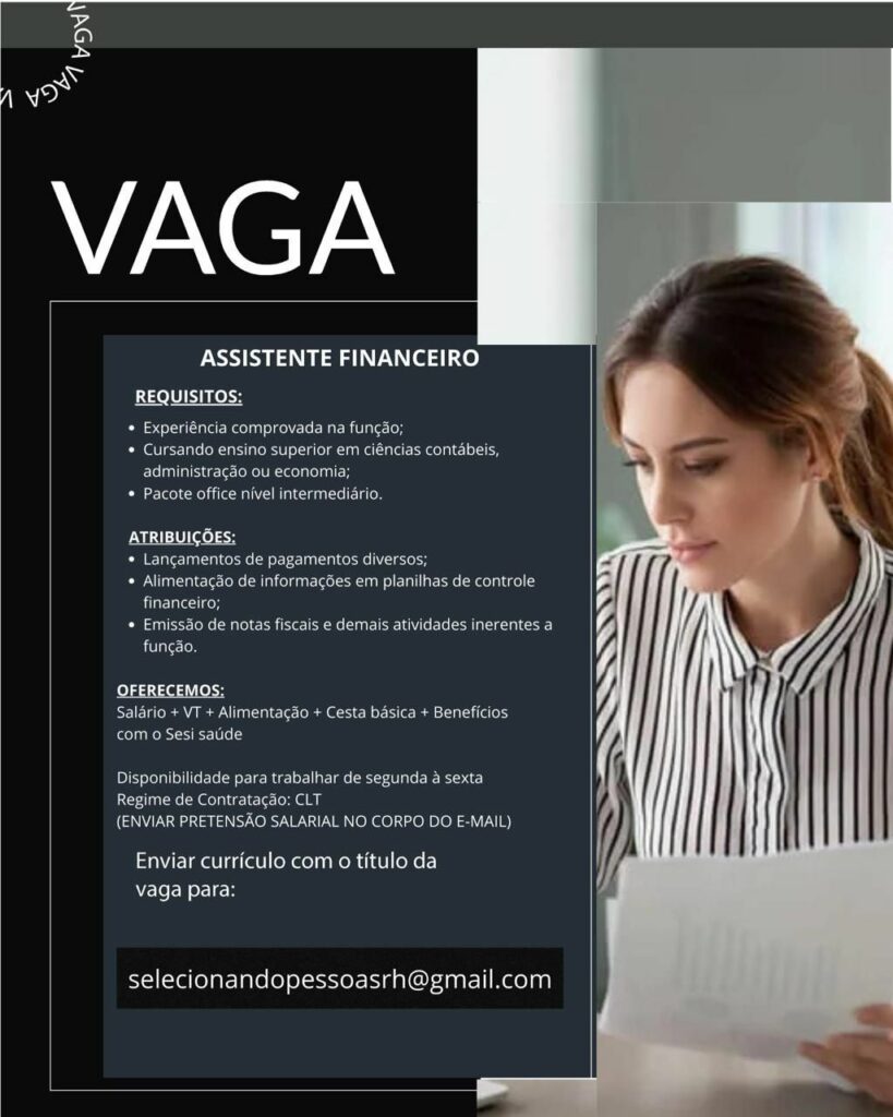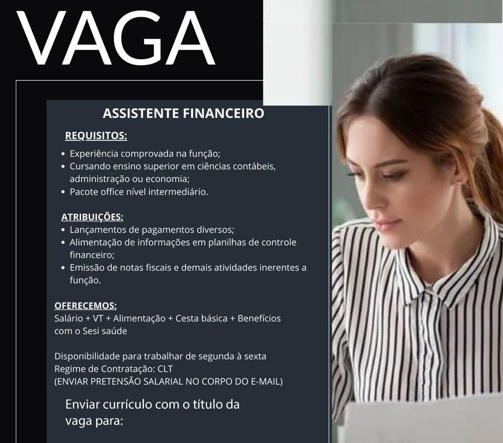 Empresa está selecionando Assistente financeiro; Envie seu currículo!