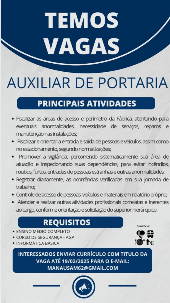 Empresa está selecionando Auxiliar de portaria; Envie seu currículo!