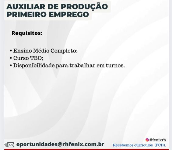 Empresa está selecionando Auxiliar de produção primeiro emprego; Envie seu currículo!