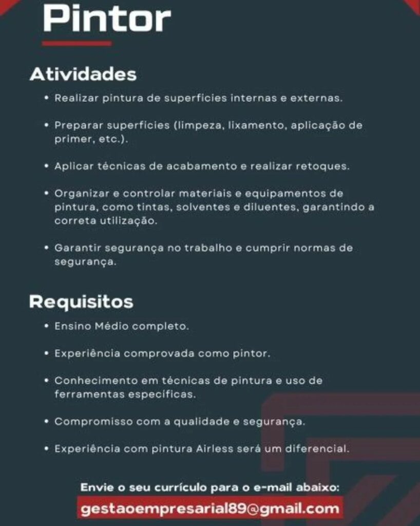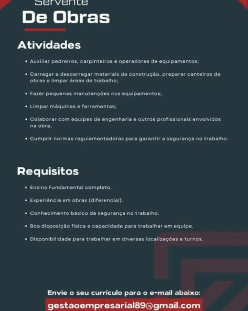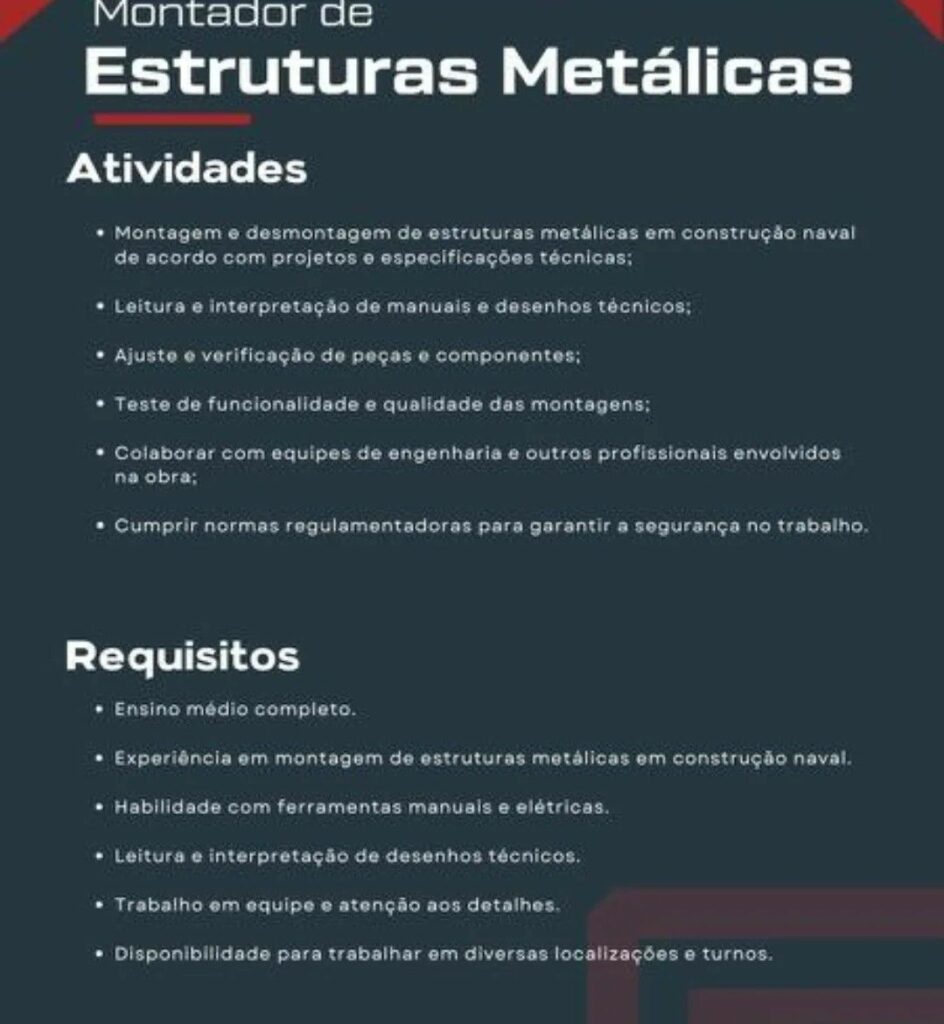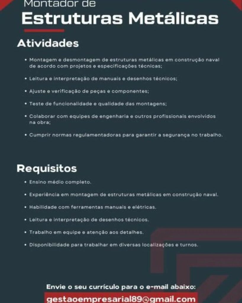 Empresa está selecionando Montador de estruturas metálicas, Servente de obras, Pintor; Envie seu currículo!
