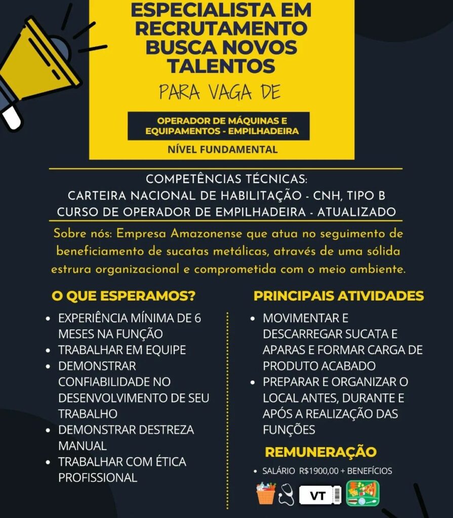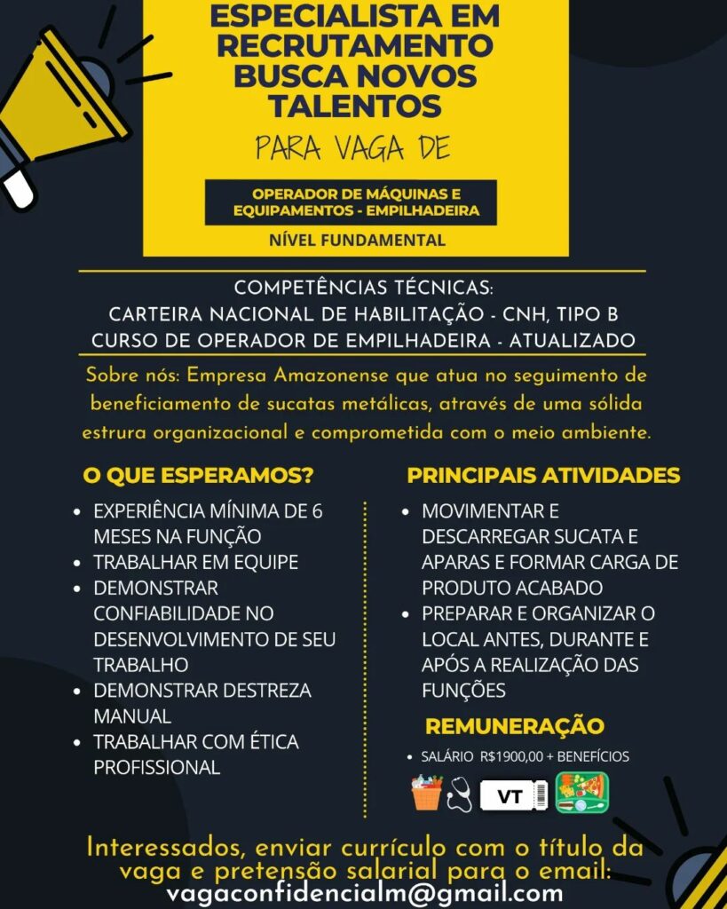 Empresa está selecionando Operador de máquinas e equipamentos empilhadeira; Envie seu currículo!