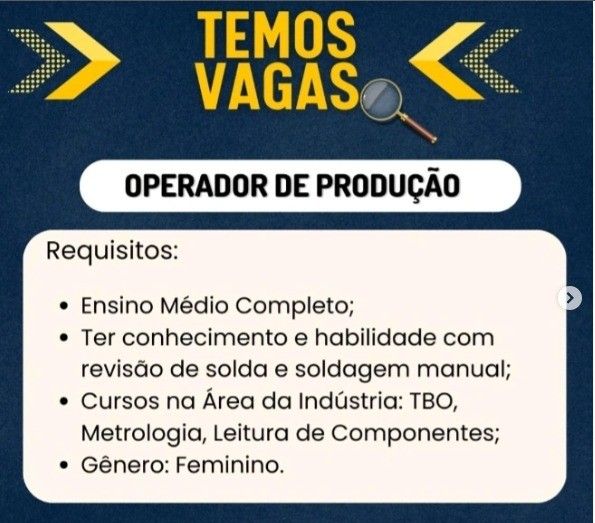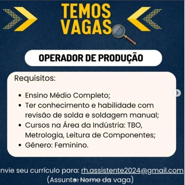 Empresa está selecionando Operador de produção; Envie seu currículo!