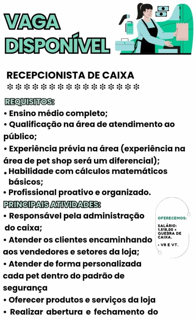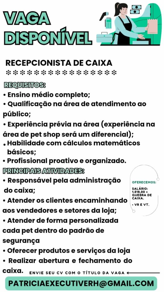 Empresa está selecionando Recepcionista de caixa; Envie seu currículo!