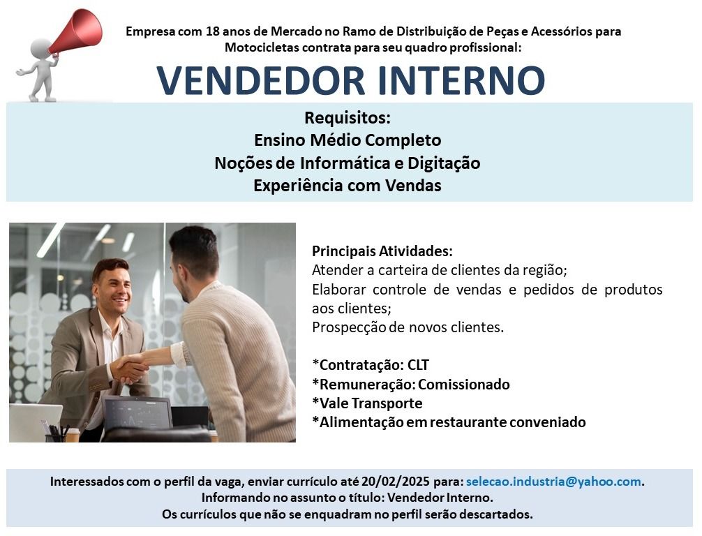 Empresa está selecionando Vendedor interno; Envie seu currículo!