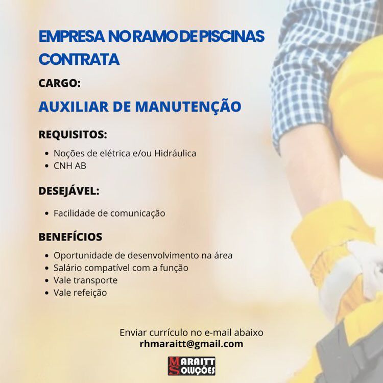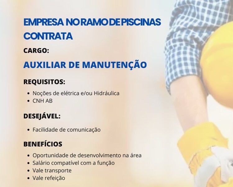 Empresa no ramo de piscinas seleciona Auxiliar de manutenção; Envie seu currículo!