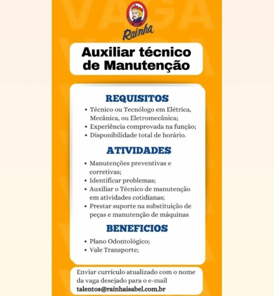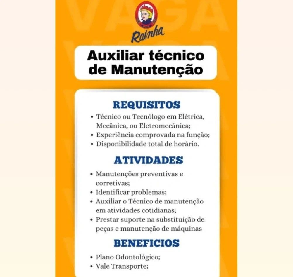 Empresa Rainha seleciona Auxiliar técnico de Manuntenção; Envie seu currículo!