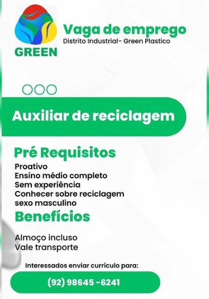 Green plástico está selecionando Auxiliar de reciclagem; Envie seu currículo!