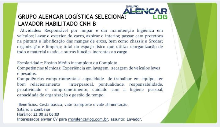 Grupo Alencar logística seleciona Lavador; Envie seu currículo!