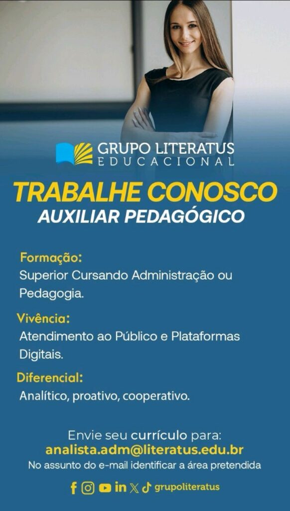Grupo educacional Literatus seleciona Instrutores para capacitação de Jovem Aprendiz, Auxiliar pedagógico; Envie seu currículo!
