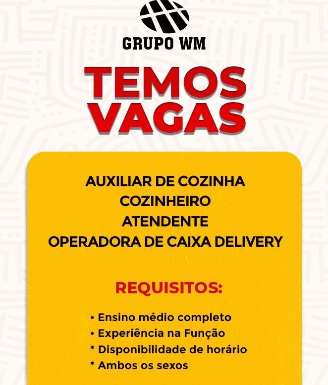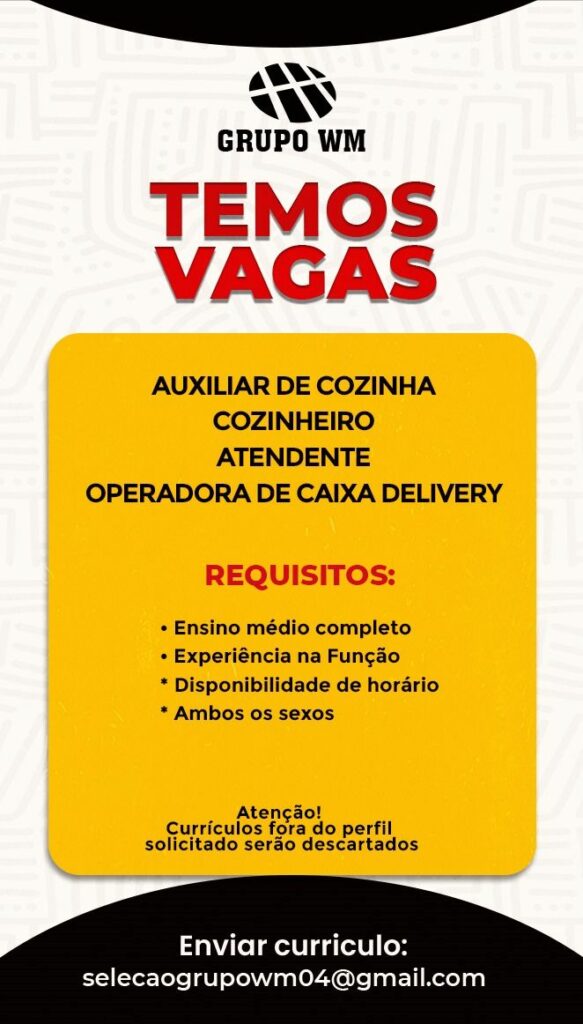 Grupo WM seleciona Auxiliar de cozinha, Cozinheiro, Atendente, Operadora de caixa delivery; Envie seu currículo!