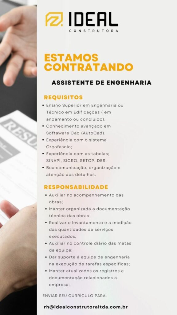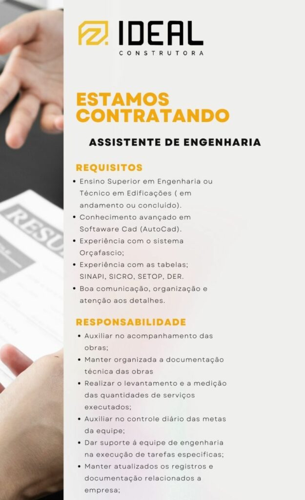Ideal construtora está selecionando Assistente de engenharia; Envie seu currículo!