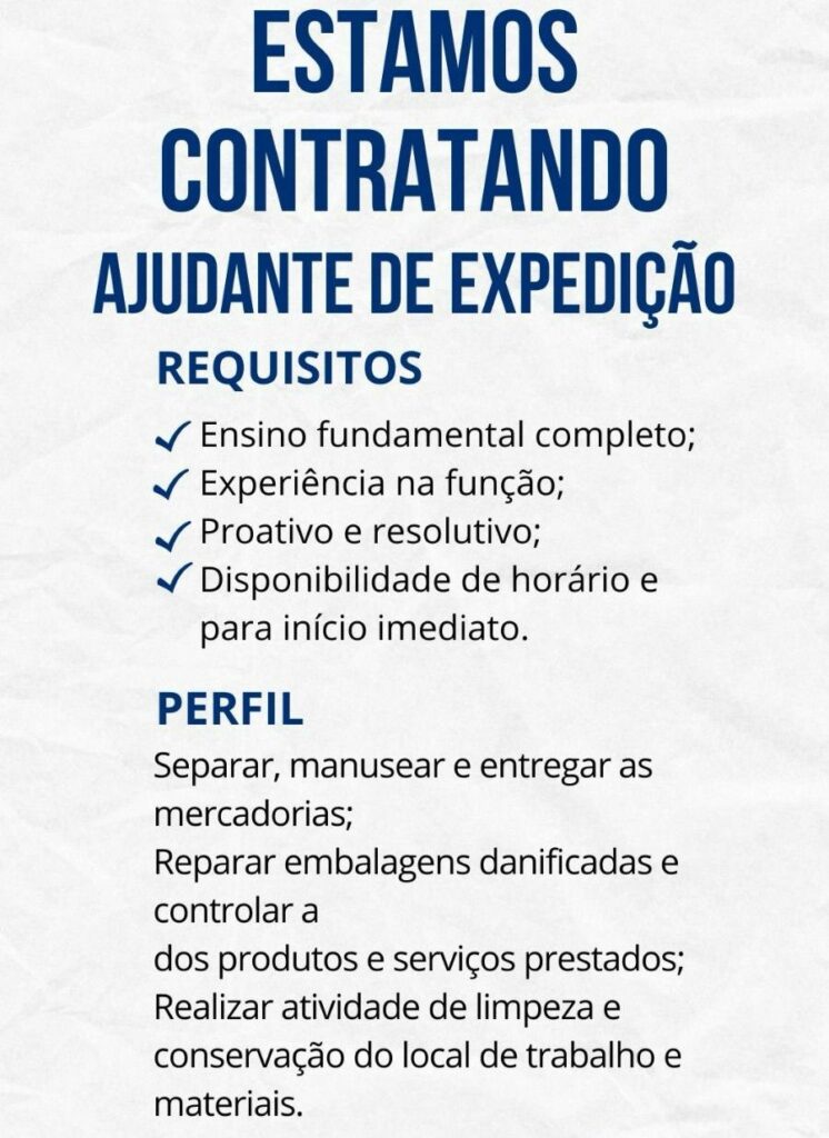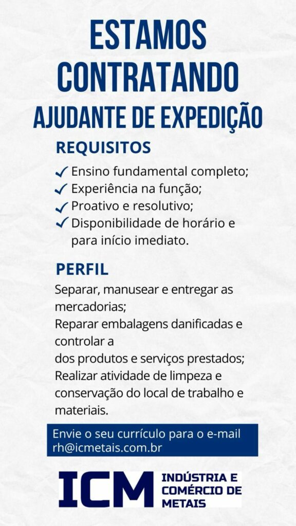 Indústria comércio de metais seleciona Ajudante de expedição; Envie seu currículo!