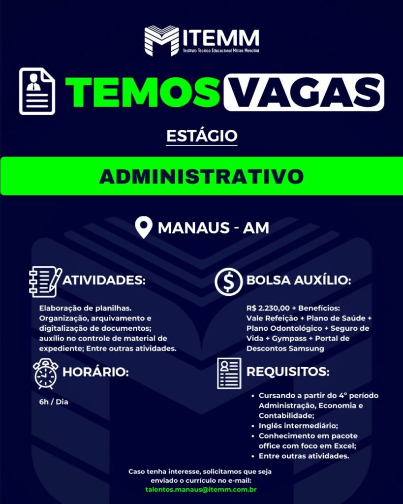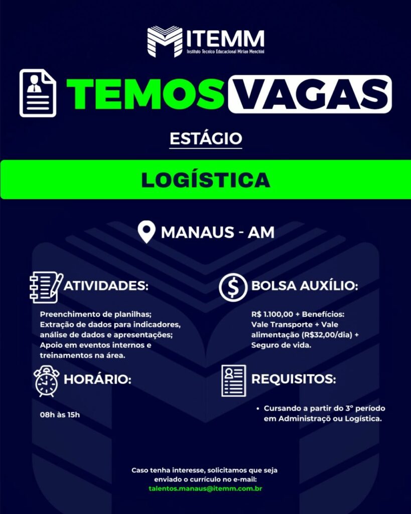 Itemm seleciona Jovem Aprendiz Produção, Estágio administrativo, Estágio logística, Estágio Engenharia; Envie seu currículo!