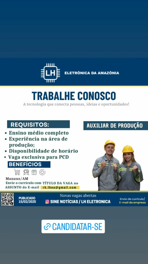 LH eletrônica da Amazônia Está selecionando Auxiliar de produção; Envie seu currículo!