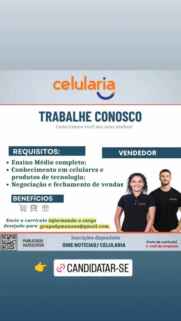 Loja de celular seleciona Vendedor; Envie seu currículo!