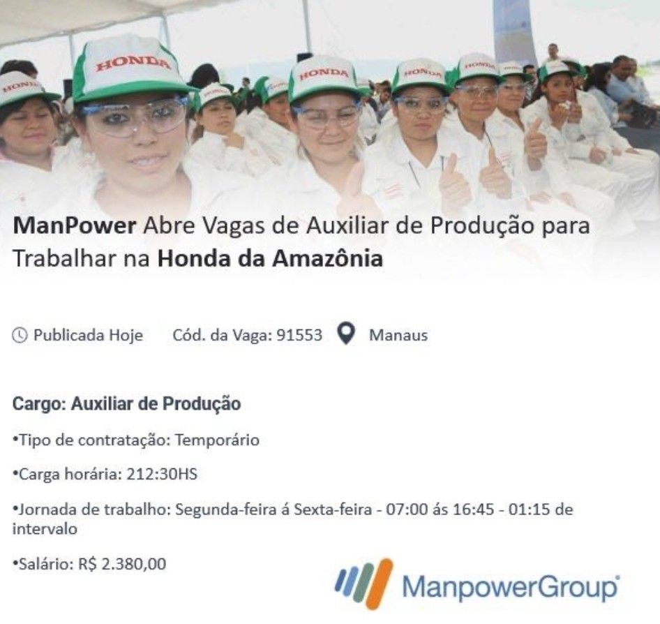 ManPower Anunciou HOJE Vagas de Auxiliar de Produção para Trabalhar na Honda