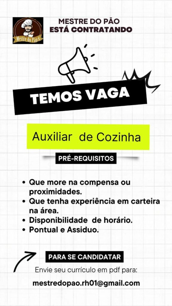 Mestre do pão contrata Auxiliar de cozinha; Envie seu currículo!