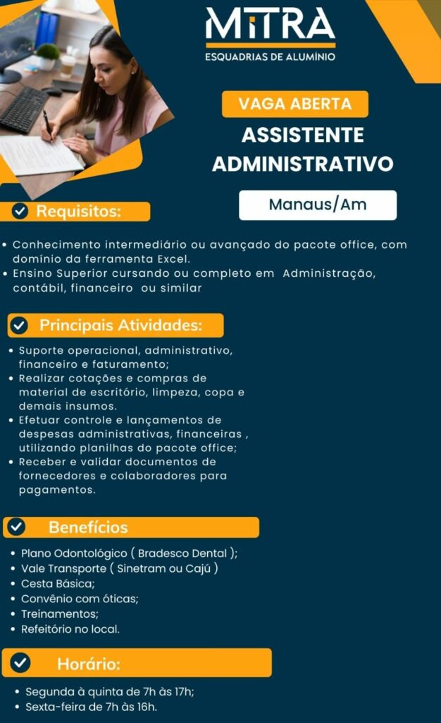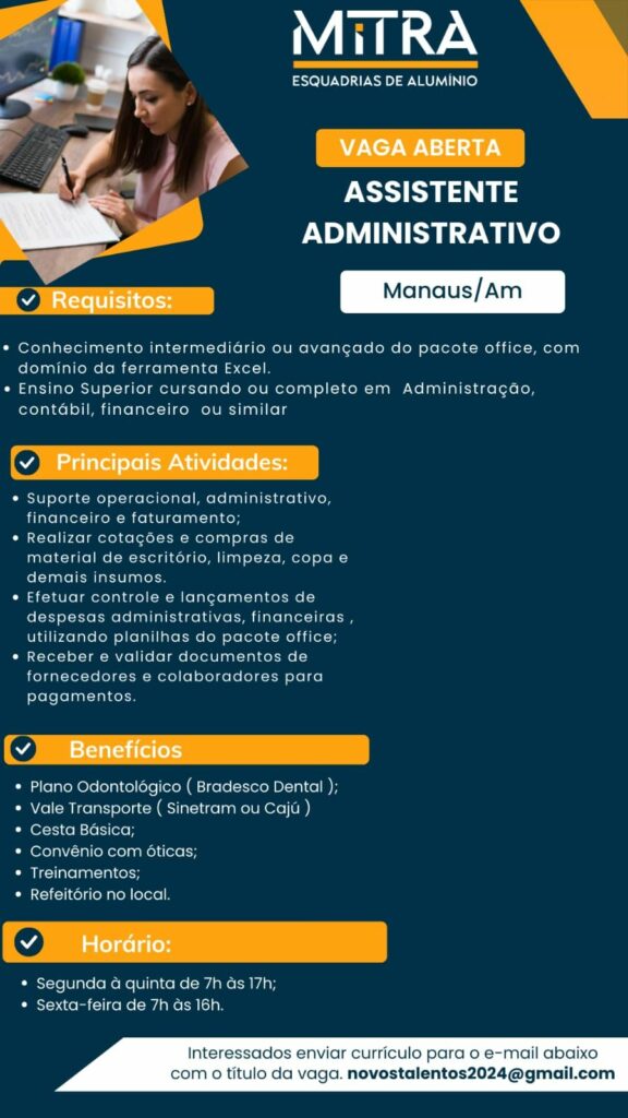 Mitra esquadra de alumínio seleciona Assistente administrativo; Envie seu currículo!