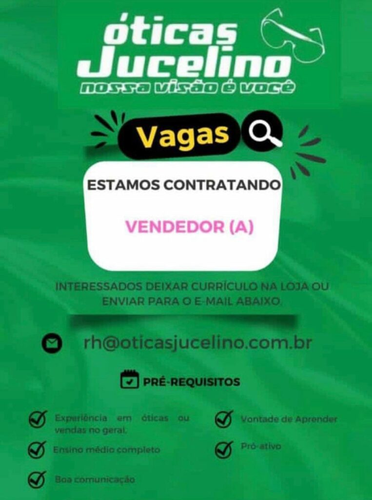 Óticas está selecionando Vendedor (a); Envie seu currículo!