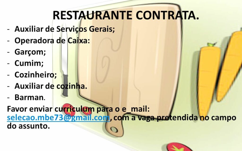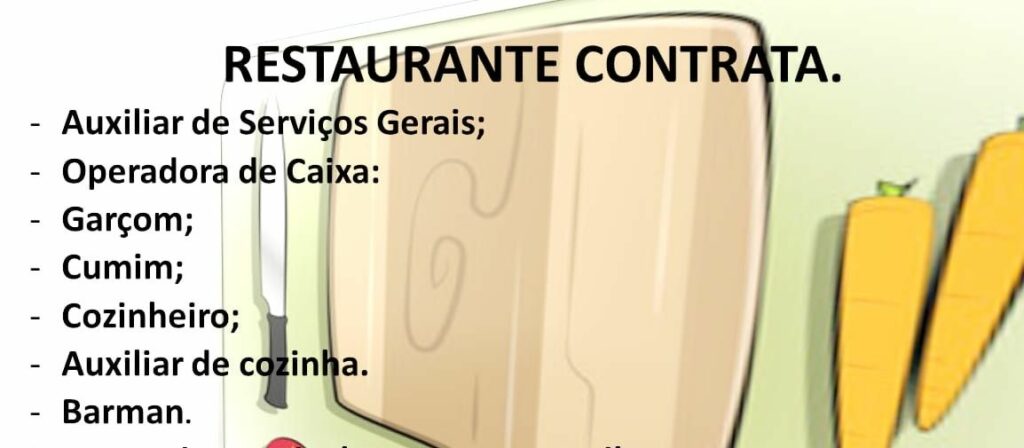 Restaurante contrata Auxiliar de serviços gerais, Operadora de caixa, Garçom, Cumim, Cozinheiro, Auxiliar de cozinha, Barman; Envie seu currículo!