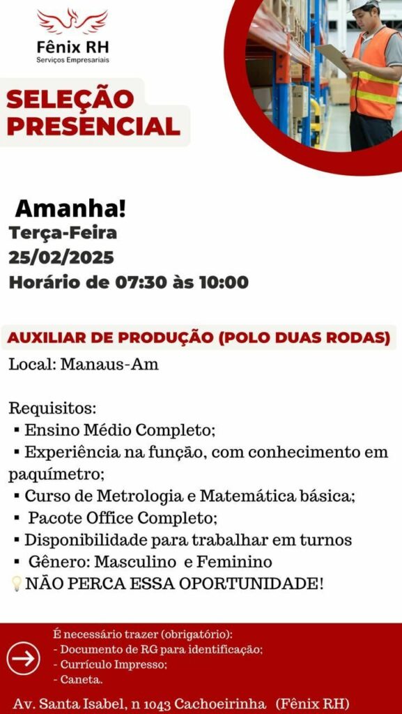 Rh está selecionando Auxiliar de produção (polo de duas rodas); Envie seu currículo!
