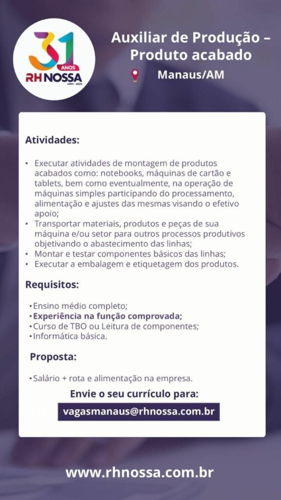 Rh está selecionando Auxiliar de produção produto acabado; Envie seu currículo!