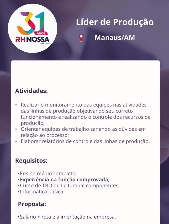 Rh está selecionando Líder de produção; Envie seu currículo!