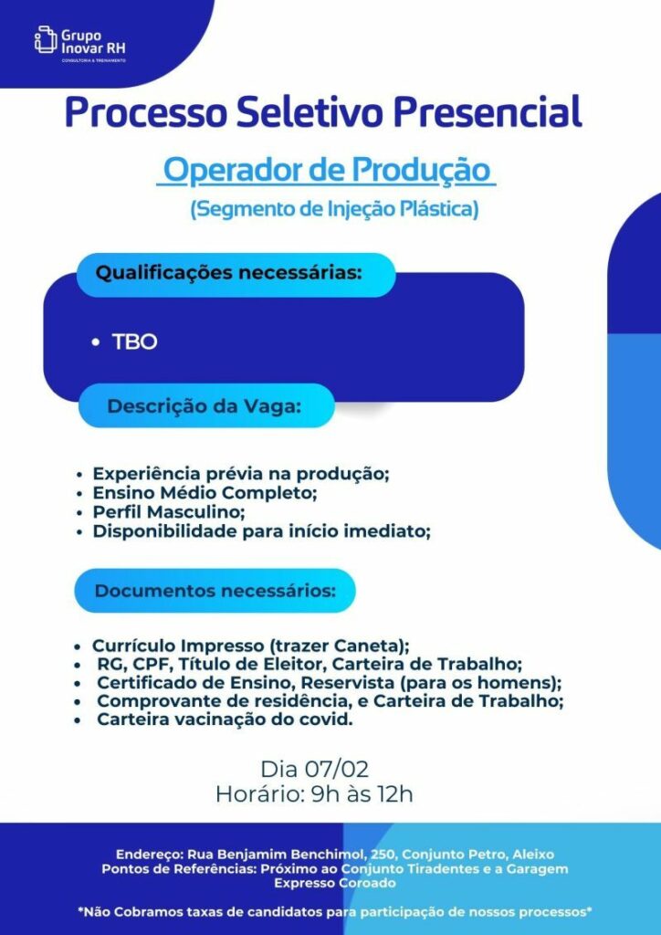 Rh está selecionando Operador de produção; Envie seu currículo!