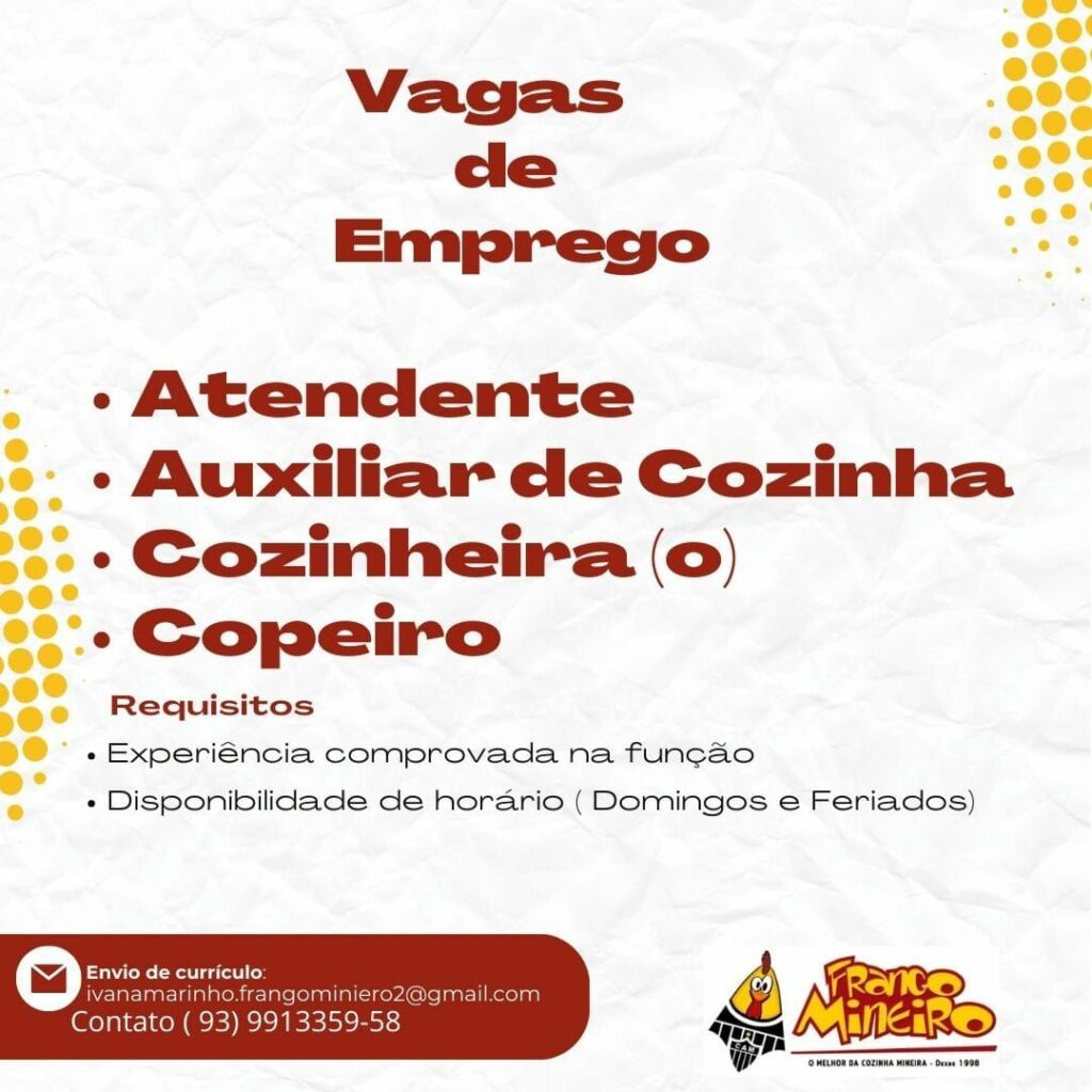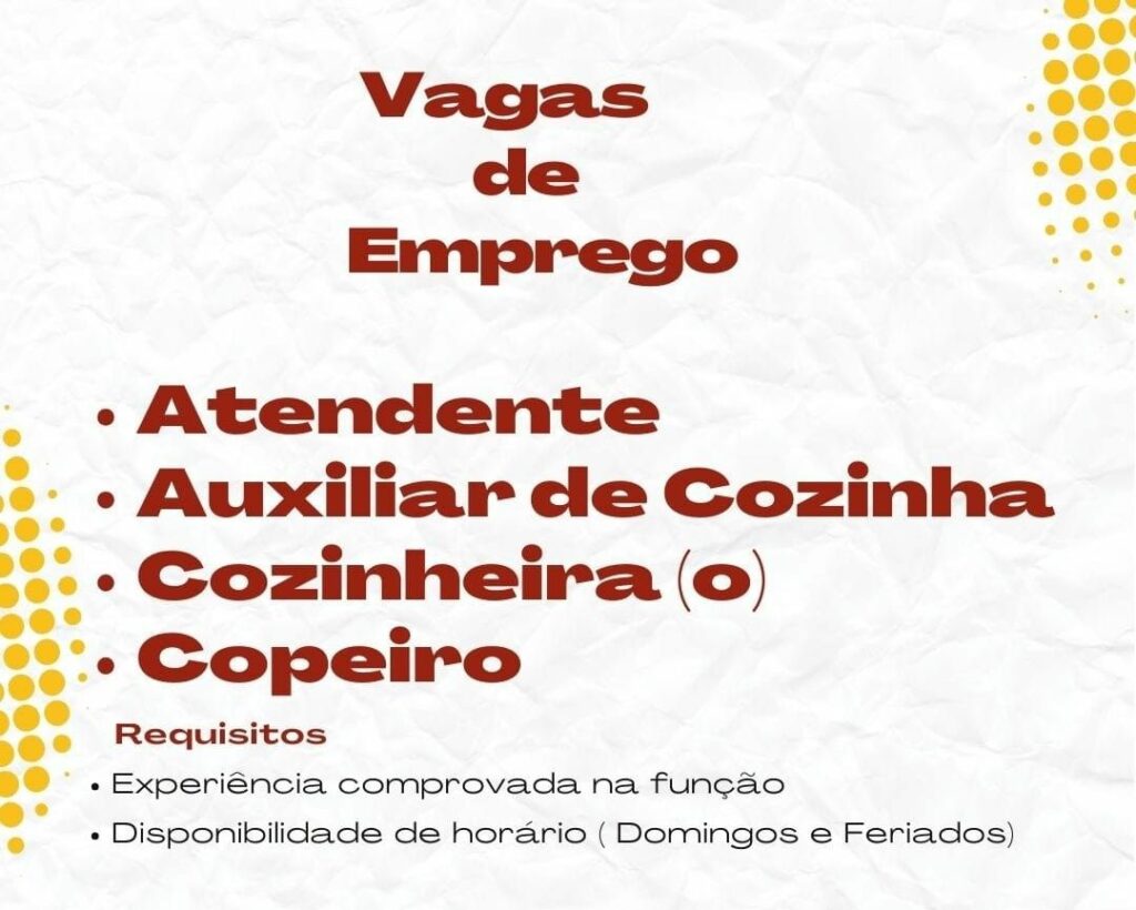 Seleção para seguintes vagas Atendente, Auxiliar de cozinha, Cozinheira (o), Copeiro; Envie seu currículo!