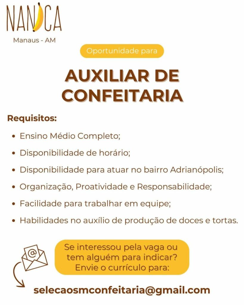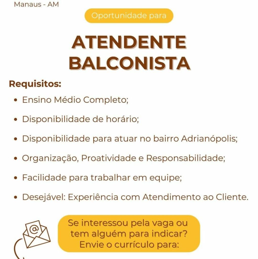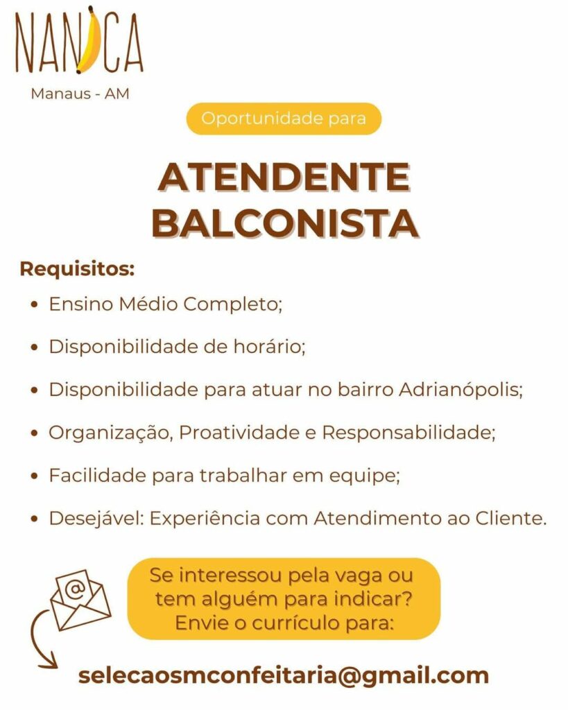 Seleção para seguintes vagas Atendente Balconista, Auxiliar de confeitaria; Envie seu currículo!