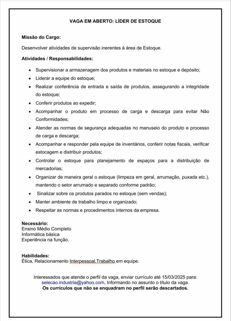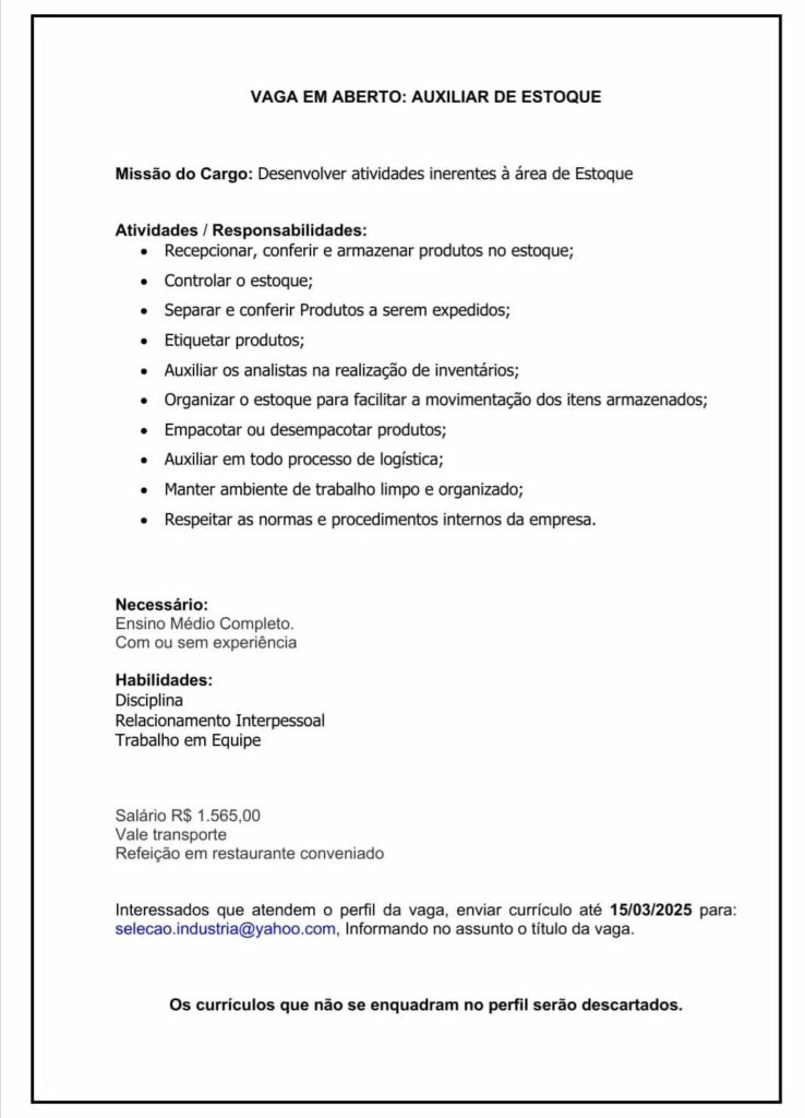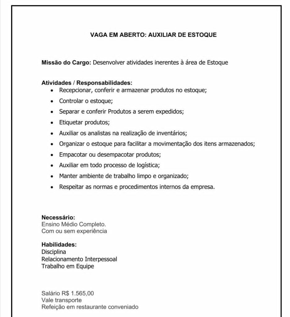 Seleção para seguintes vagas Auxiliar de estoque, Líder de estoque; Envie seu currículo!