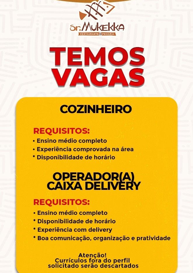 Seleção para seguintes vagas Cozinheiro, Operador (a) de caixa delivery; Envie seu currículo!