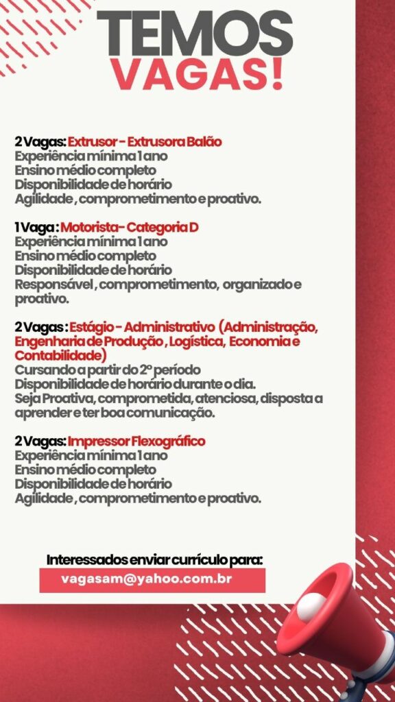 Seleção para seguintes vagas Extrusor Extrusora balão, Motorista Cat D, Estagiários, Impressor flexográfico; Envie seu currículo!