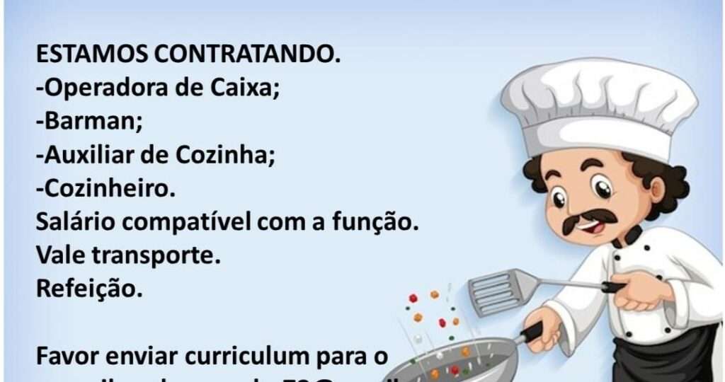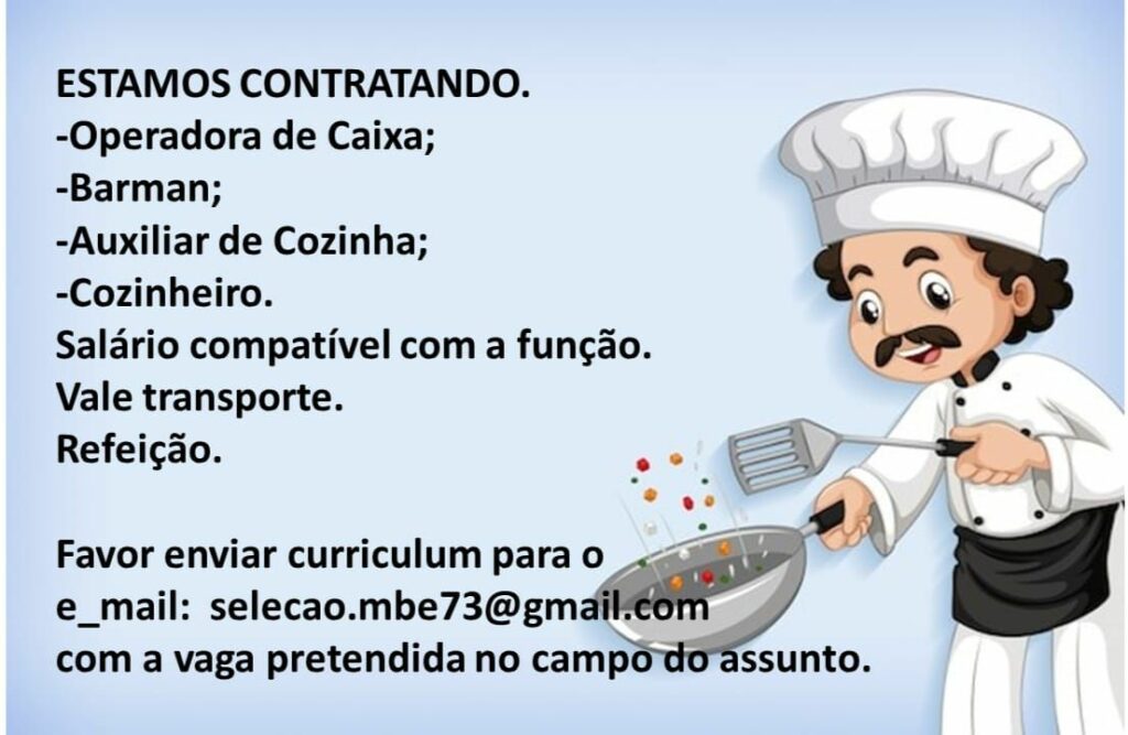 Seleção para seguintes vagas Operadora de caixa, Barman, Auxiliar de cozinha, Cozinheiro; Envie seu currículo!