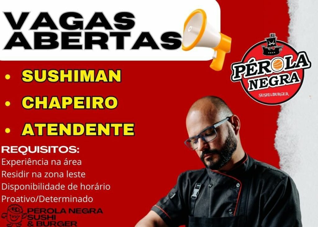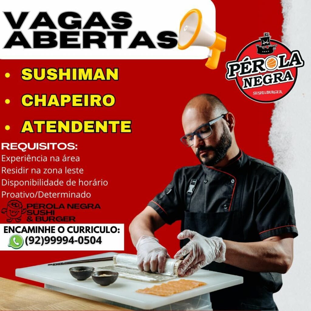 Seleção para seguintes vagas Sushiman, Chapeiro, Atendente; Envie seu currículo!