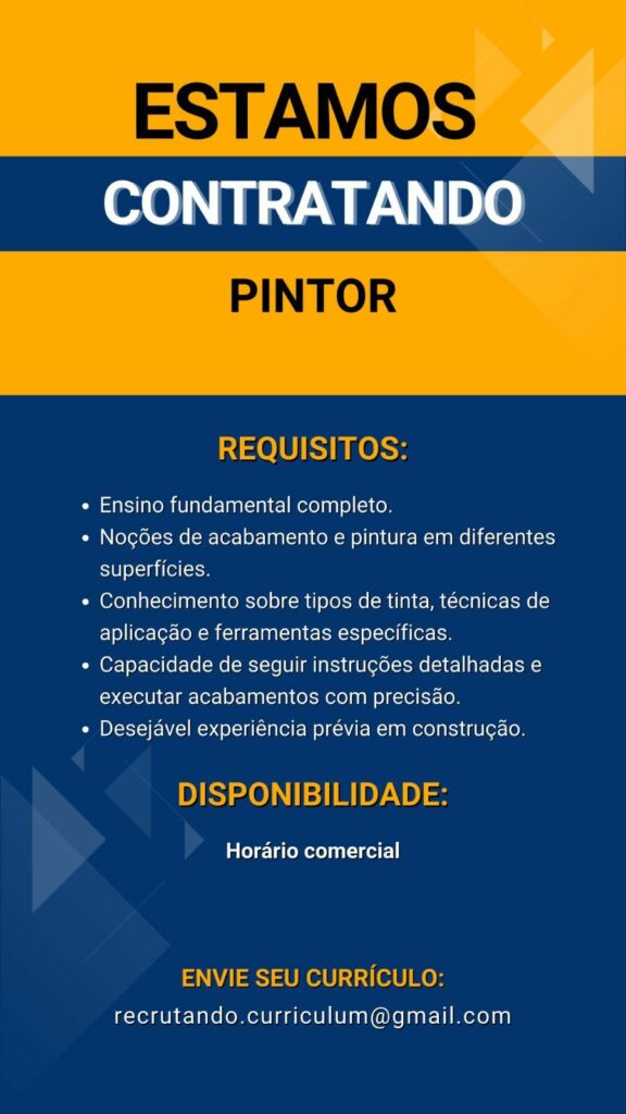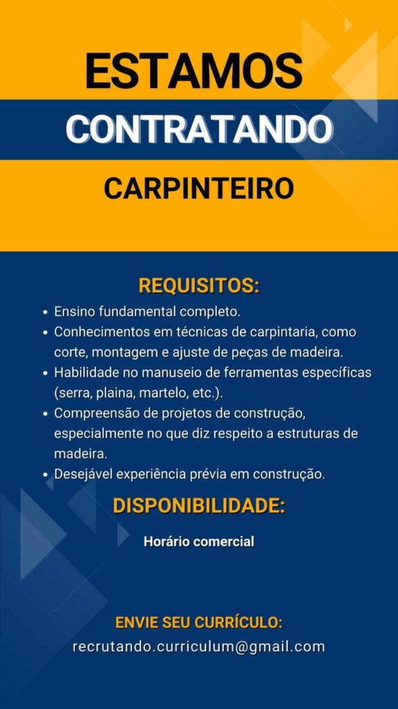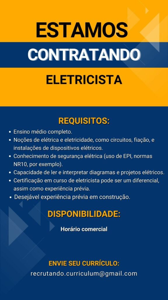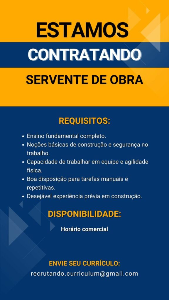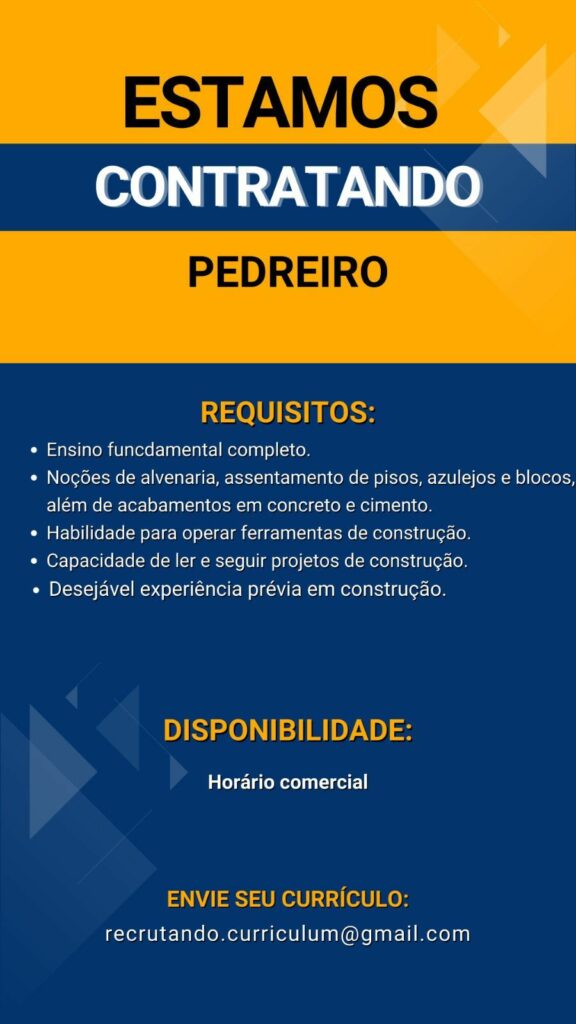 Seleção para vaga de Pedreiro, Servente de obra, Pintor, Carpinteiro, Eletricista; Envie seu currículo!
