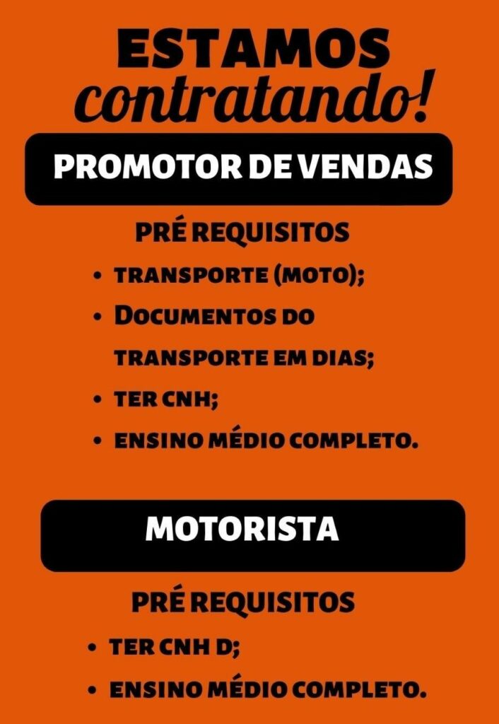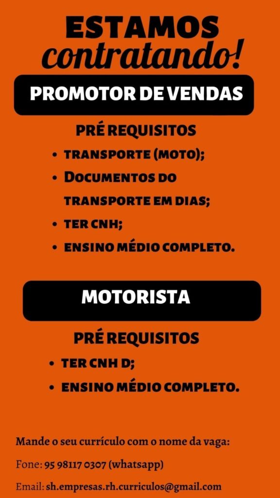 Seleção para vaga de Promotor de vendas, Motorista; Envie seu currículo!