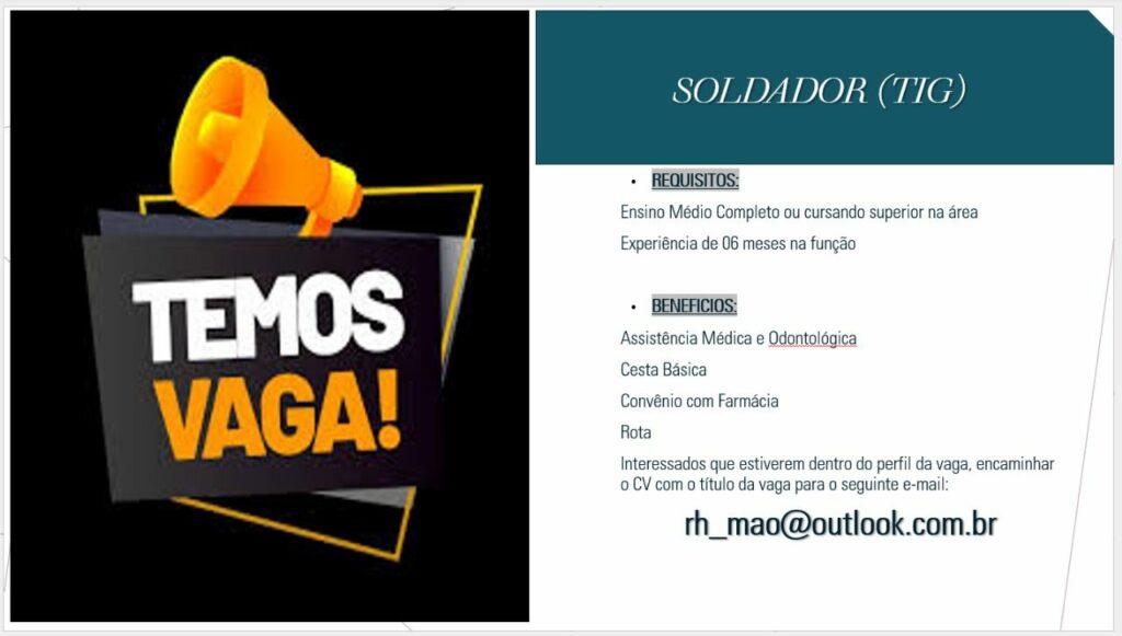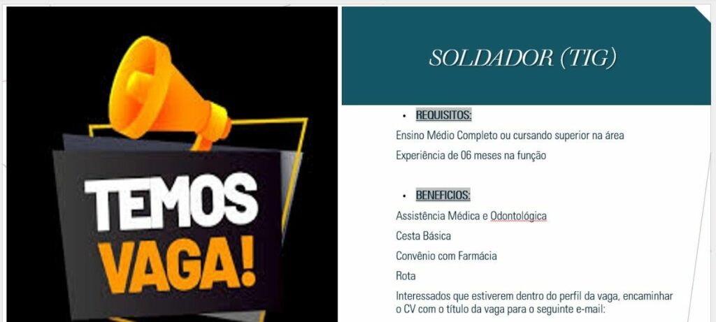 Seleção para vaga de Soldador tig; Envie seu currículo!