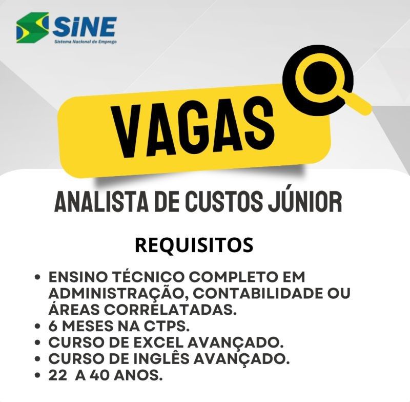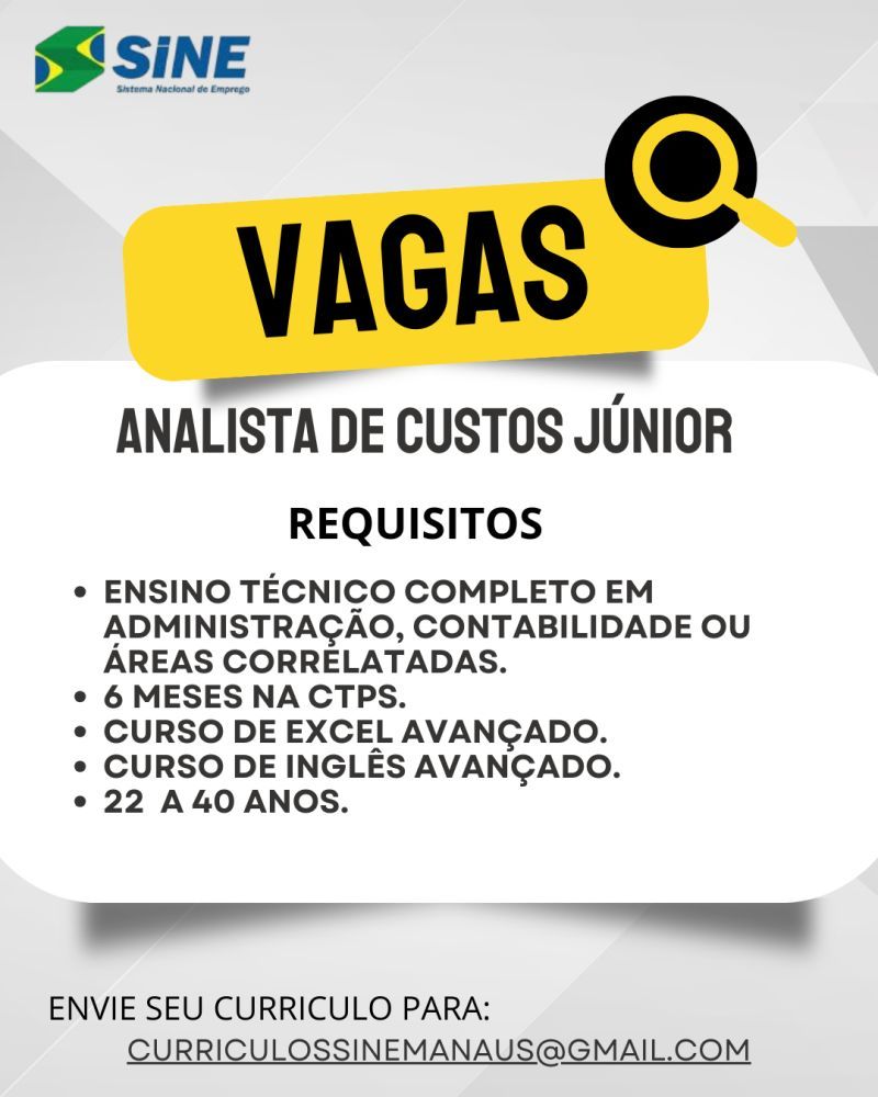 Sine está selecionando Analista de custo jr; Envie seu currículo!