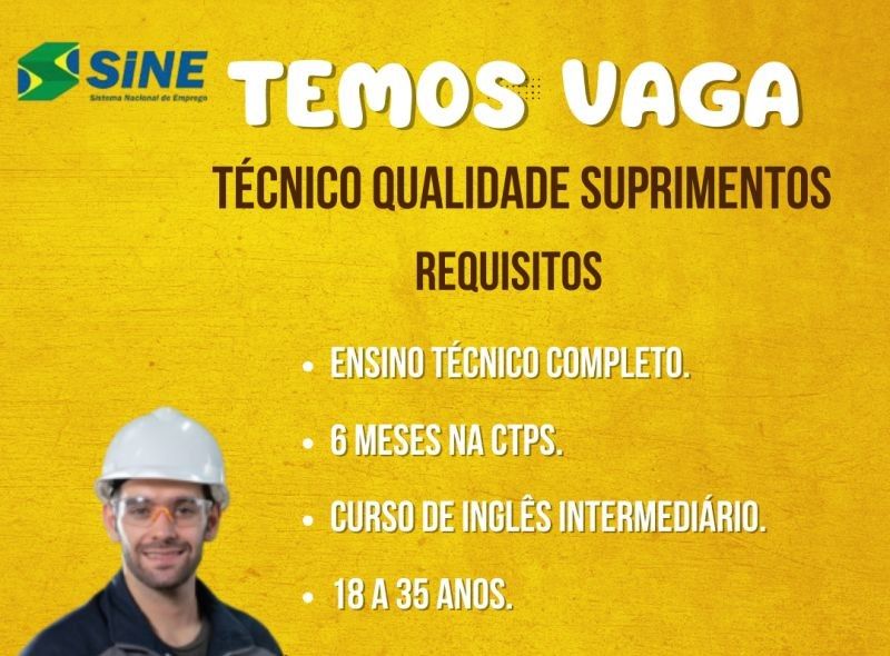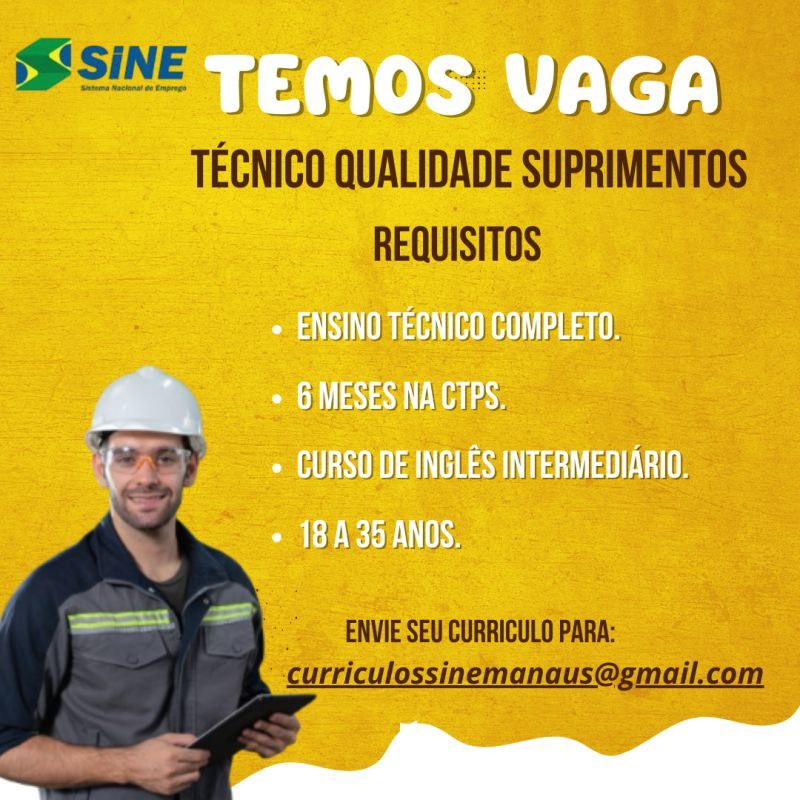 Sine está selecionando Técnico qualidade Suprimentos; Envie seu currículo!