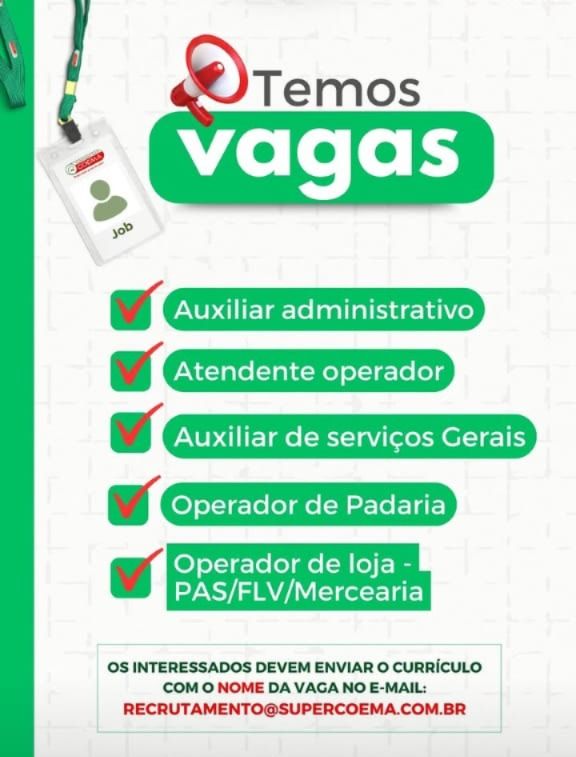 Super Coema seleciona Auxiliar administrativo, Atendente Operador, Auxiliar de serviços gerais, Operador de padaria, Operador de loja /pas / flv/ mercearia