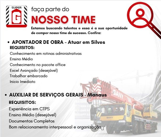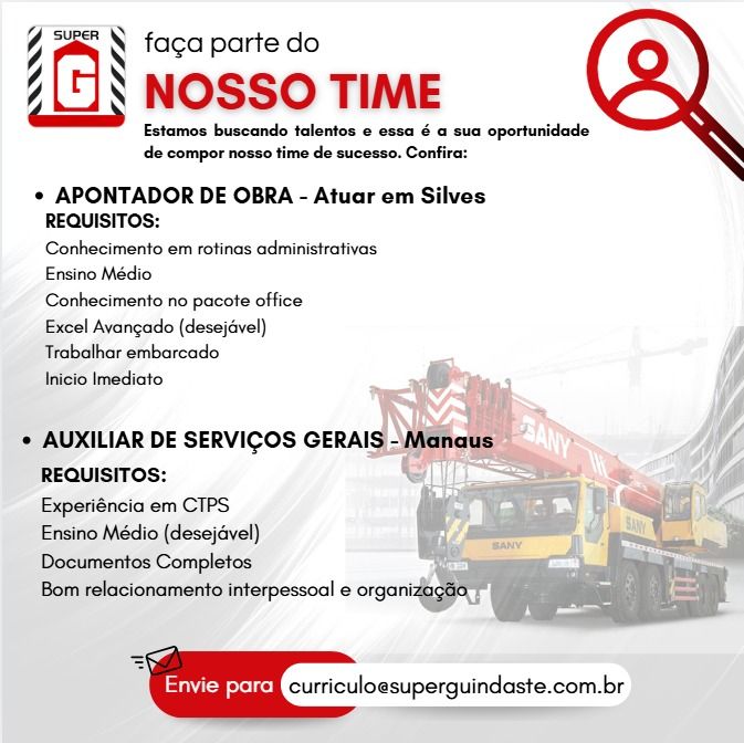 Super guindaste está selecionando Apontador de obra; Envie seu currículo!