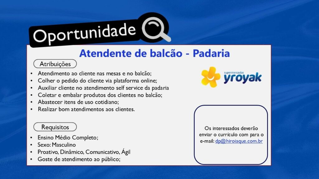 Yroyak supermercado está selecionando Atendente de balcão padaria; Envie seu currículo!