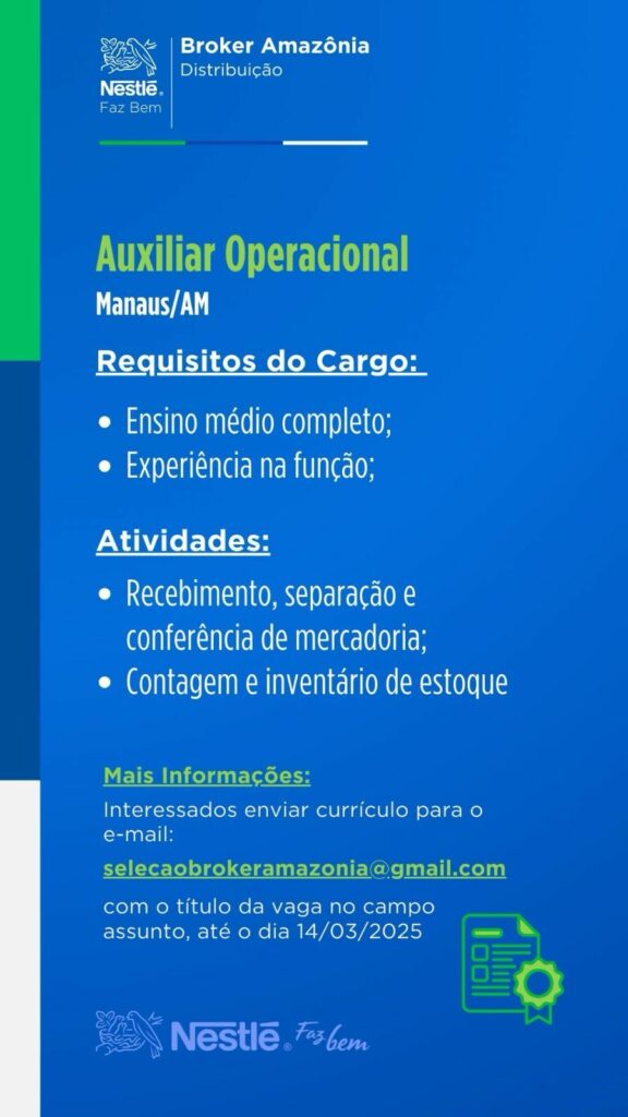 Broker Amazônia Seleciona Auxiliar operacional, Assistente de sac; Envie seu currículo!