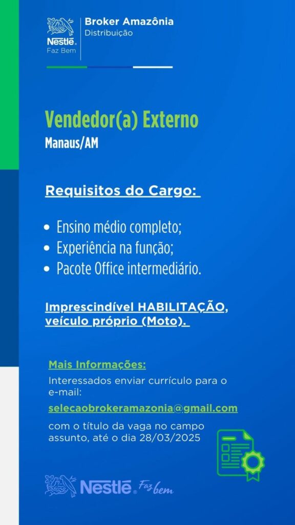 Broker da Amazônia seleciona Vendedor (a) externo; Envie seu currículo!