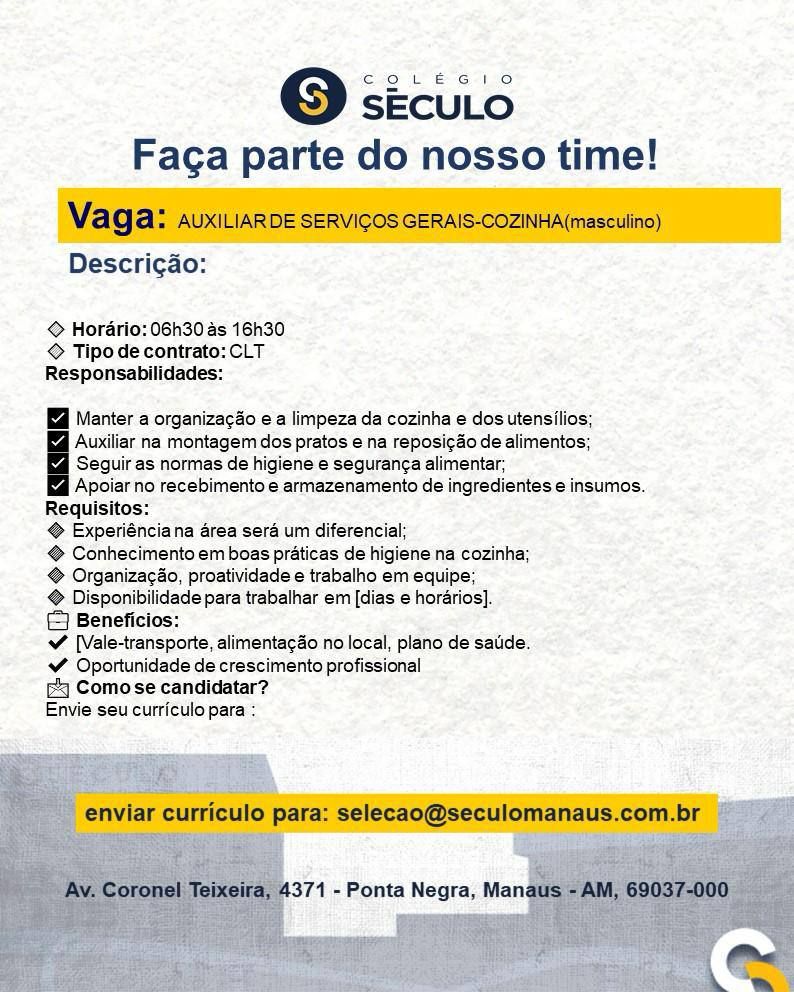 Centro educacional século seleciona Auxiliar de serviços gerais cozinha; Envie seu currículo!