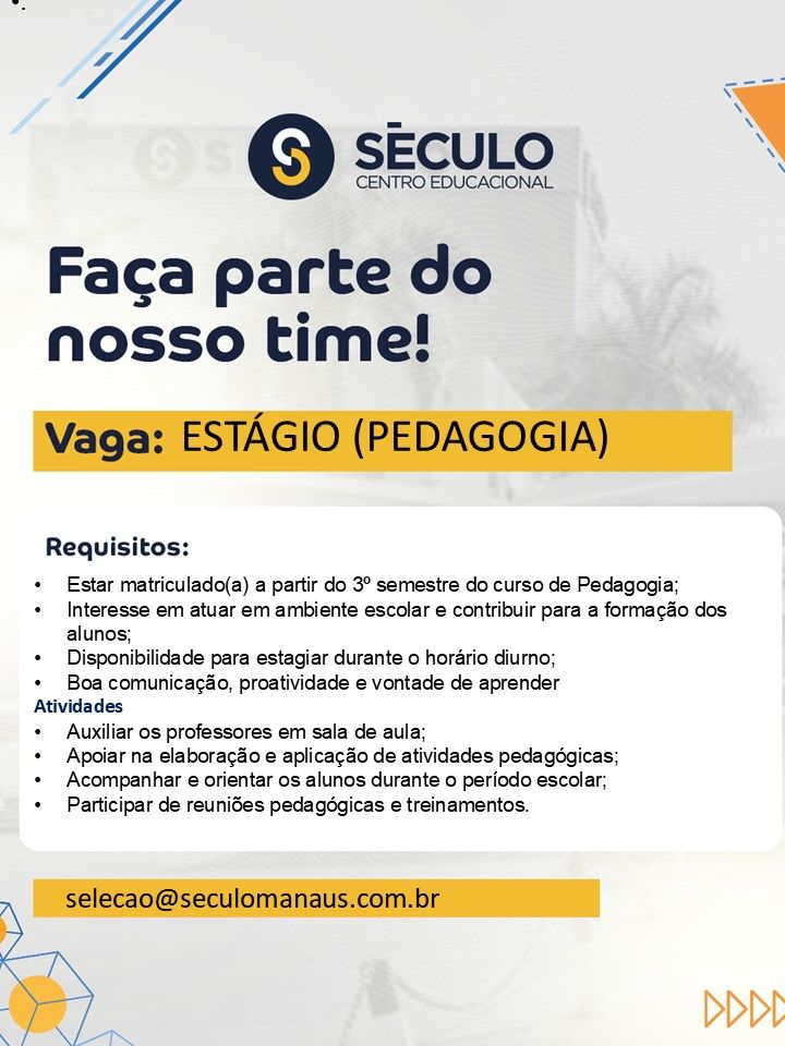 Centro educacional século seleciona Estágio Pedagogia; Envie seu currículo!