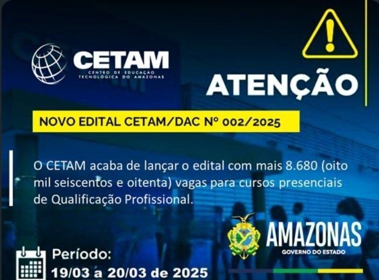 O CETAM acaba de lançar o edital com mais 8.680 (oito mil seiscentos e oitenta) vagas para cursos presenciais de Qualificação Profissional,