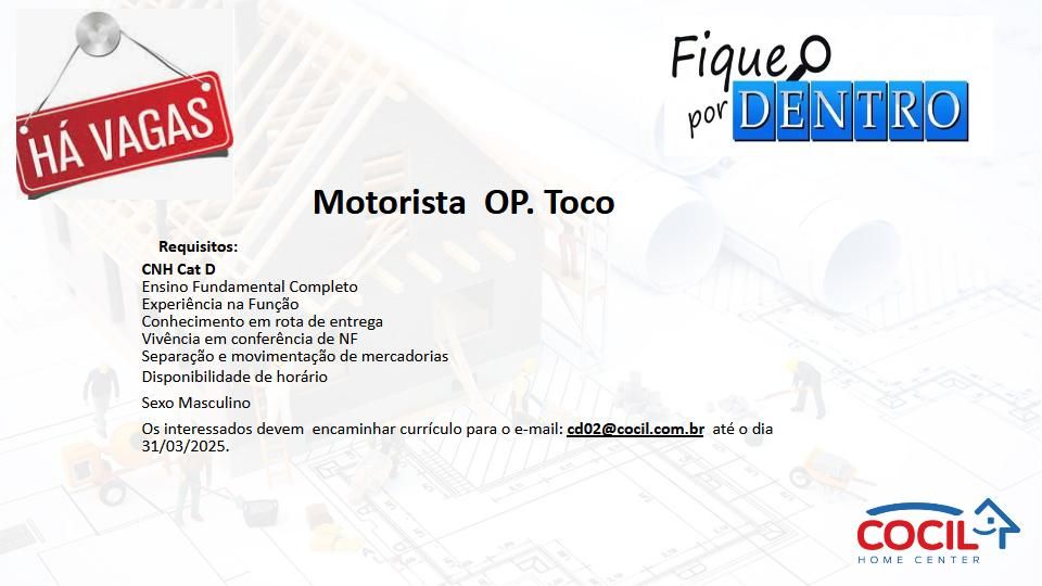 O processo seletivo para esta(s) vaga(s) não cobra absolutamente nada pela sua candidatura. Portanto, jamais aceite qualquer tipo de cobrança para cadastrar seu currículo.